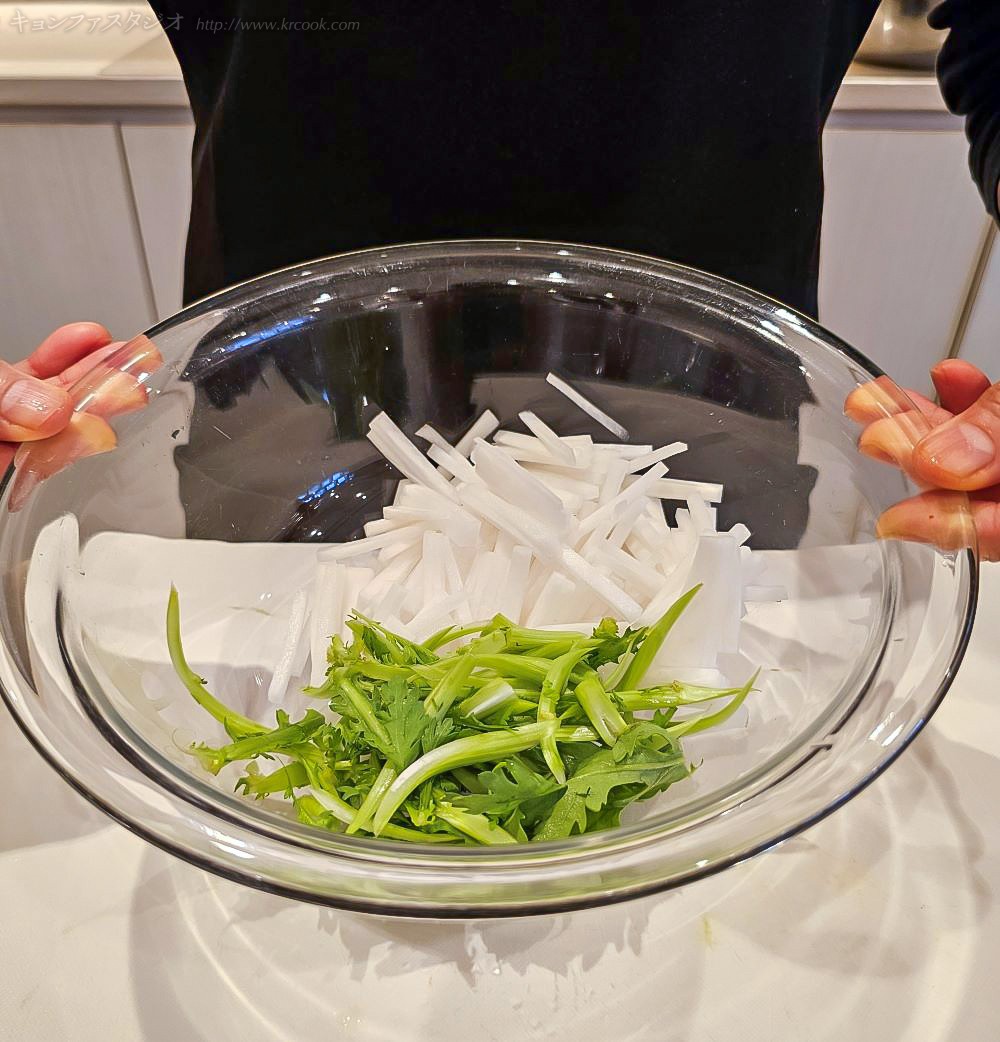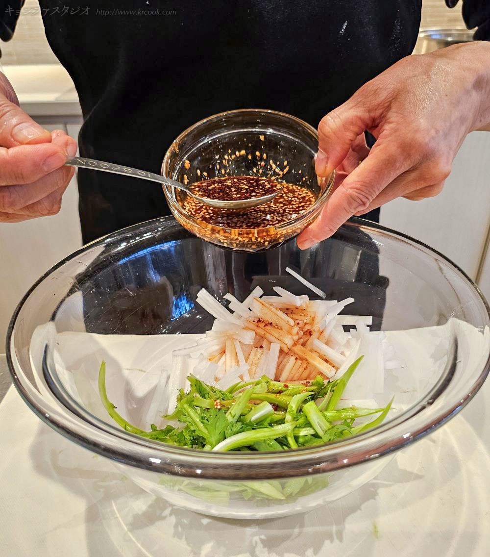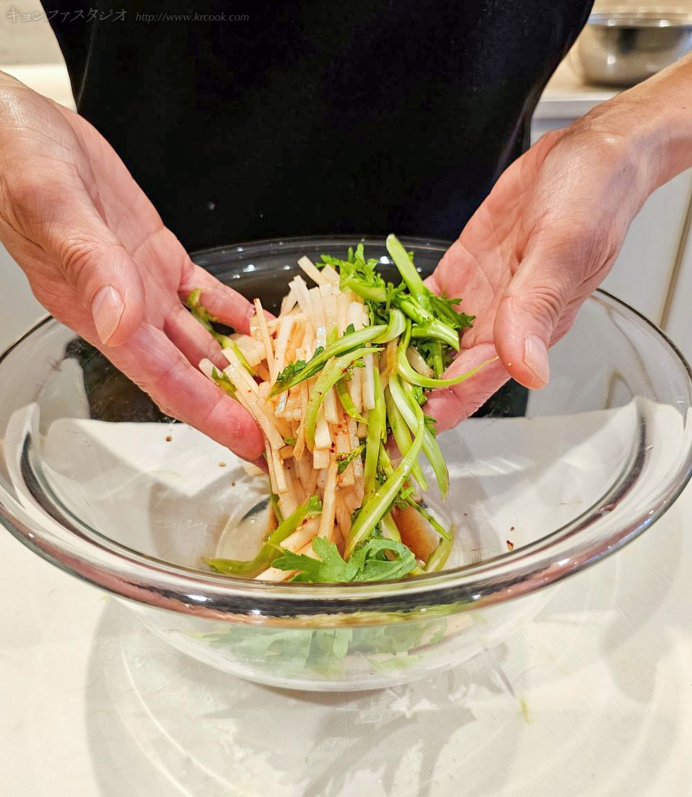 4. ボウルに大根と春菊の茎を入れ、チョカンジャンを半量ほどかけて軽く和える。