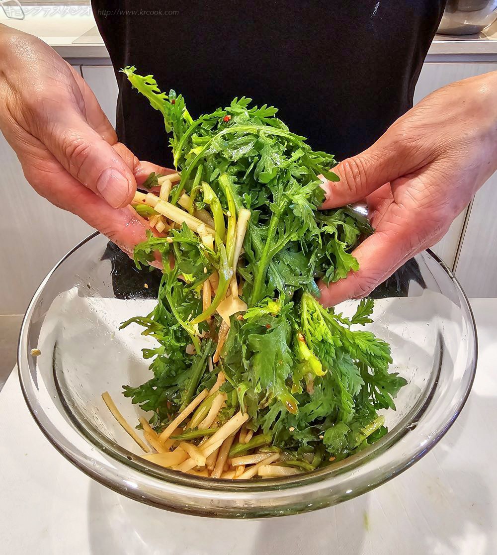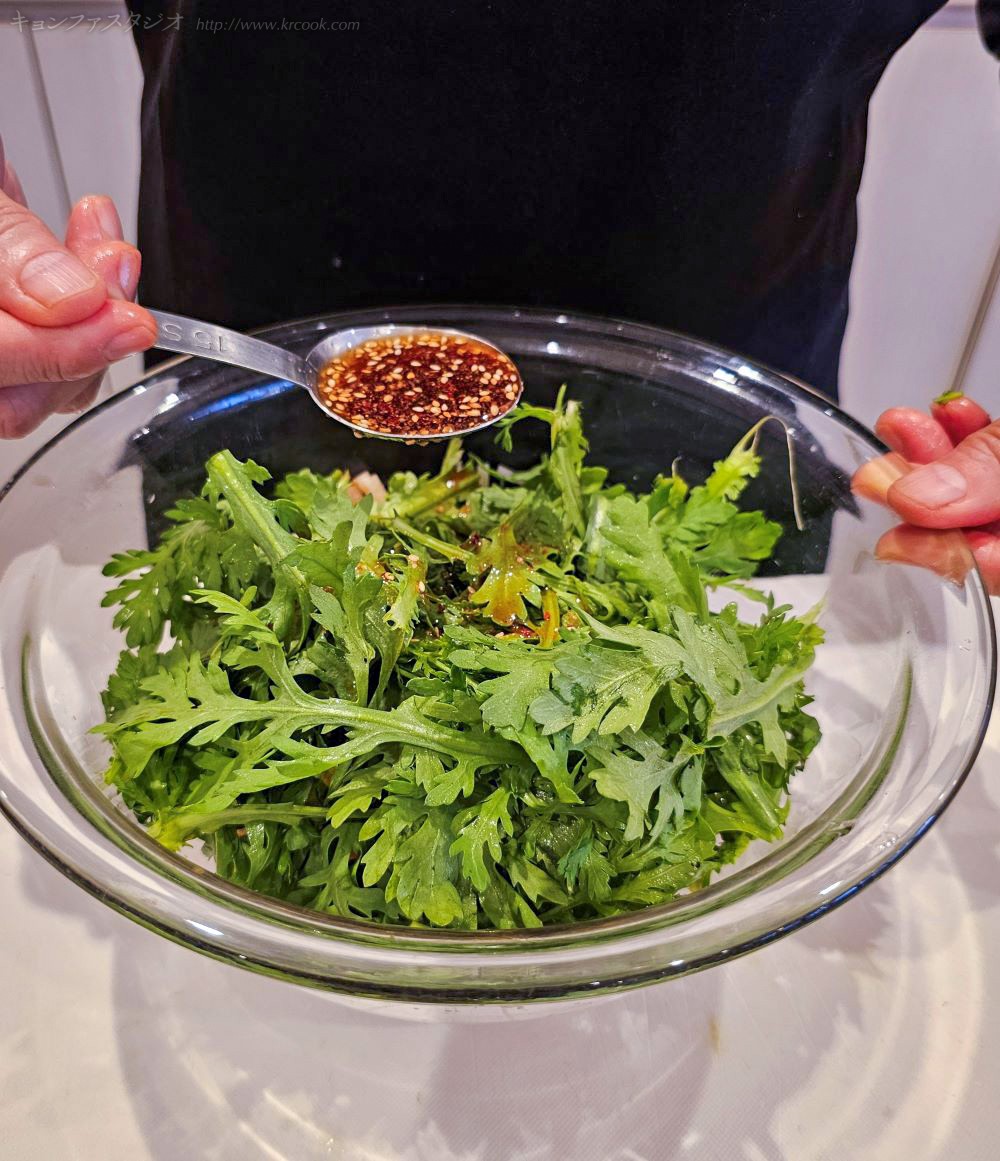 春菊の葉を加え残りのチョカンジャンを適量加え、全体を和える。
