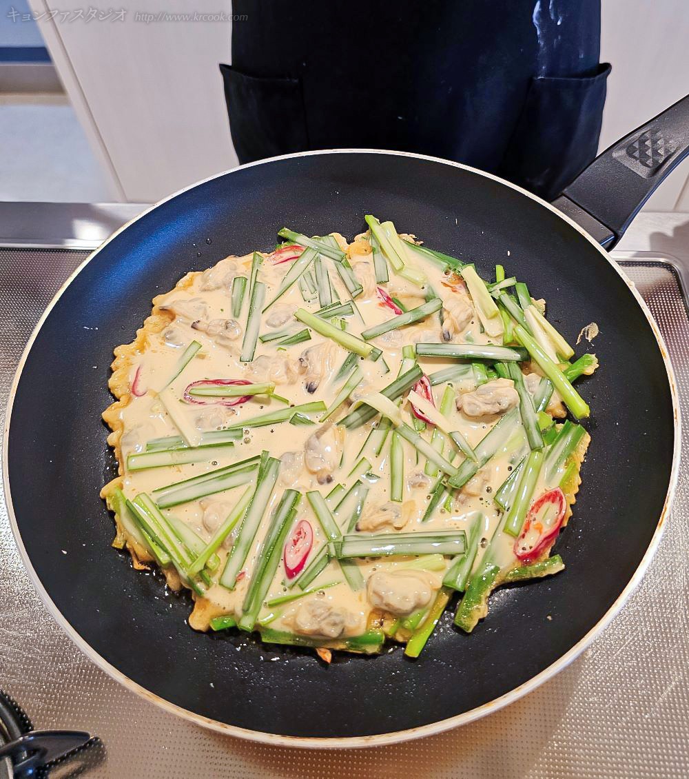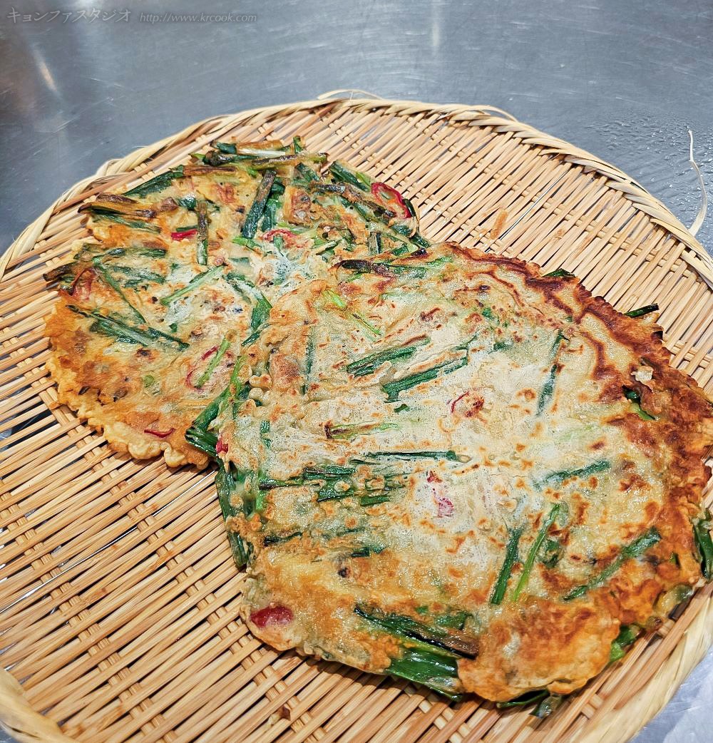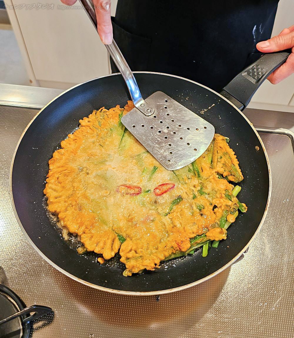 しょうゆと塩を加え、あさりを入れて混ぜ、にらも加えて混ぜ合わせる。 - フライパンを熱してごま油をひき、3の生地を半量入れて均等に薄く広げる。