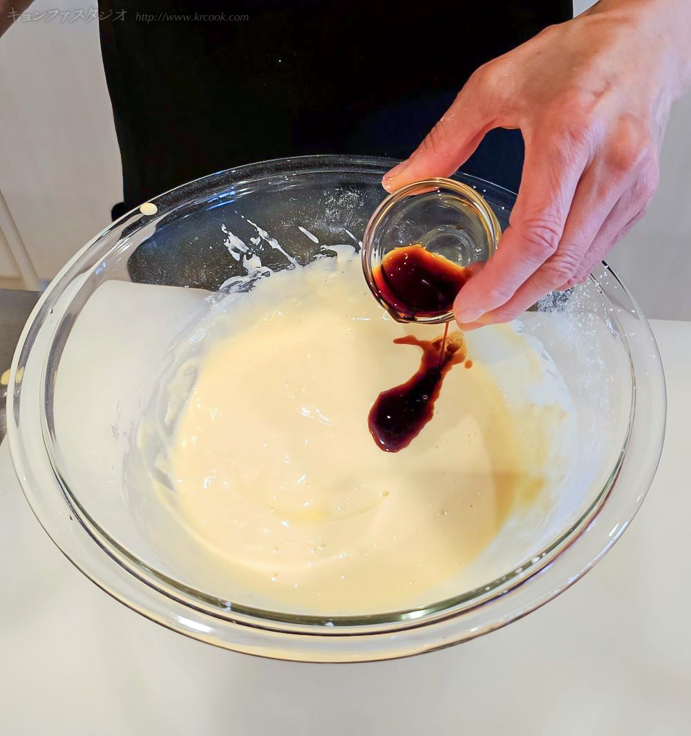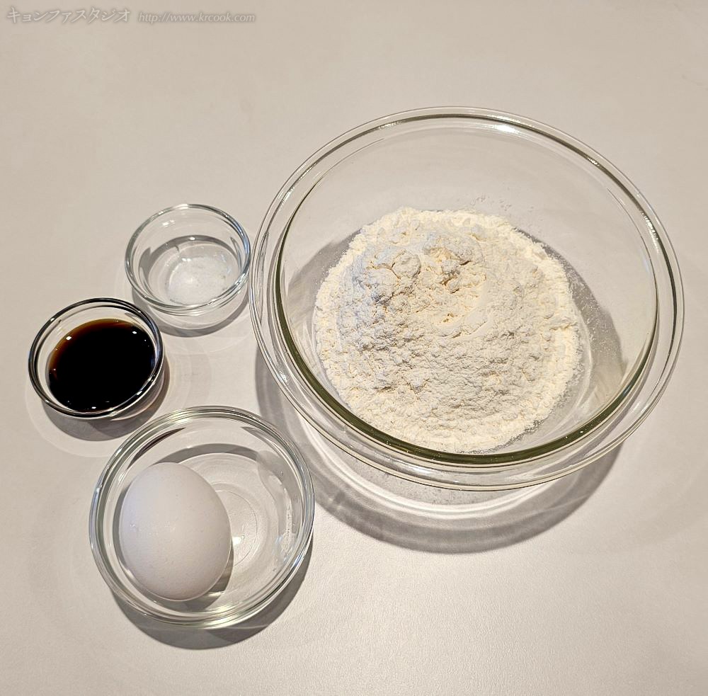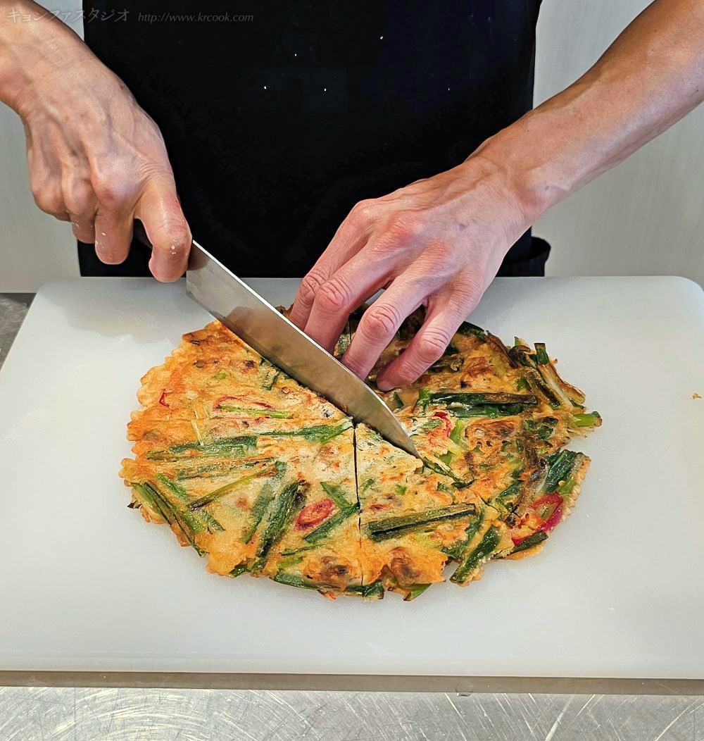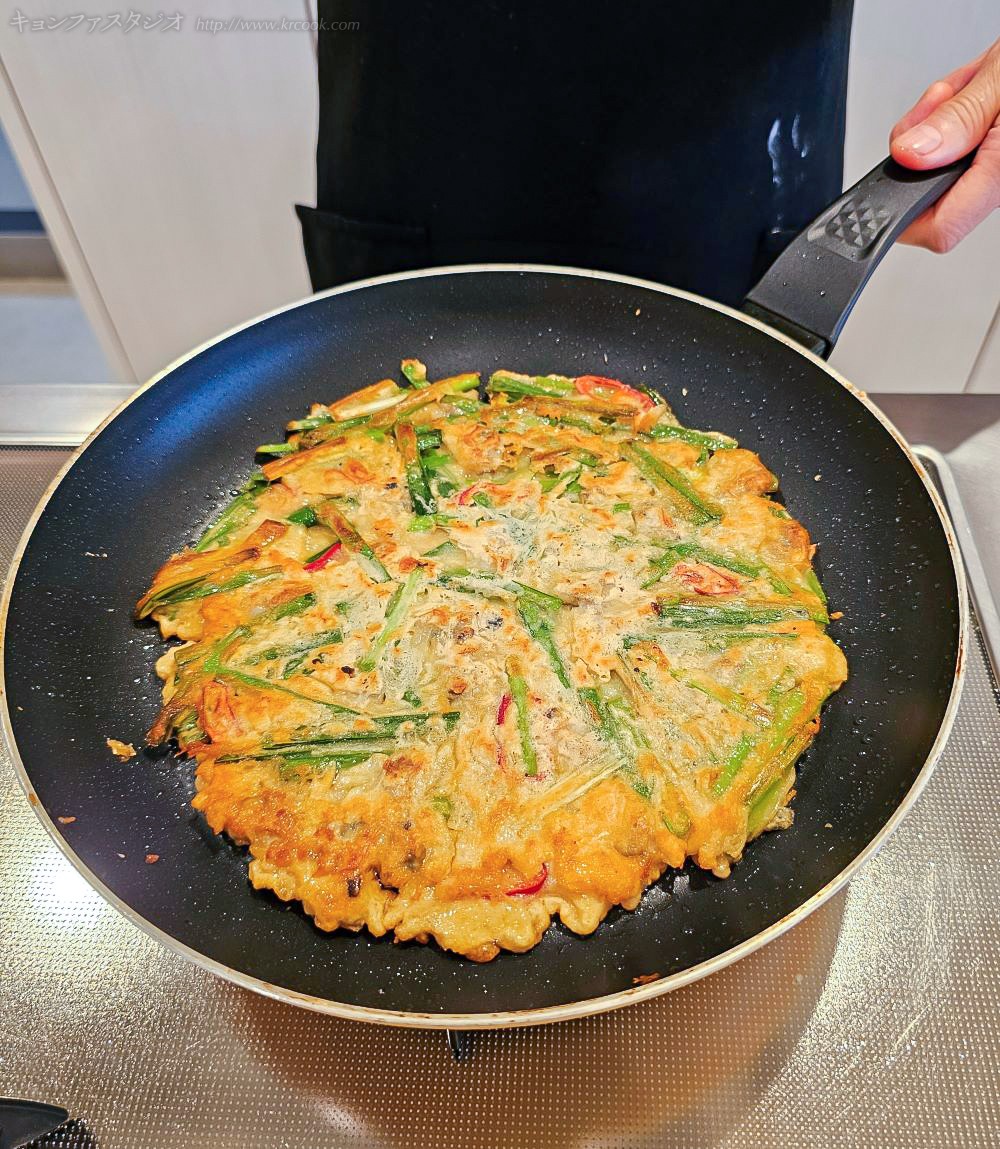 しょうゆと塩を加え、あさりを入れて混ぜ、にらも加えて混ぜ合わせる。 - フライパンを熱してごま油をひき、3の生地を半量入れて均等に薄く広げる。