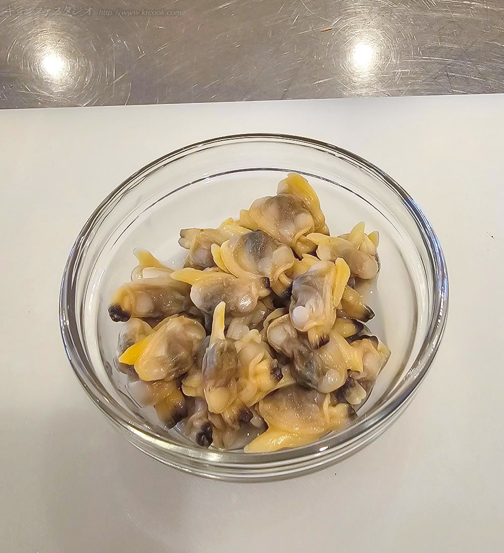 *生のあさりのむき身は塩でふり洗いし、ザルに上げてペーパータオルで水気をふき取りましょう。