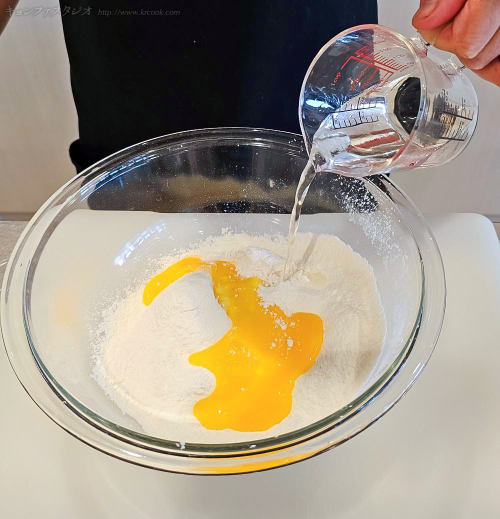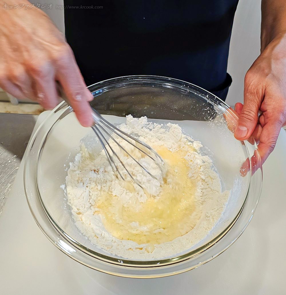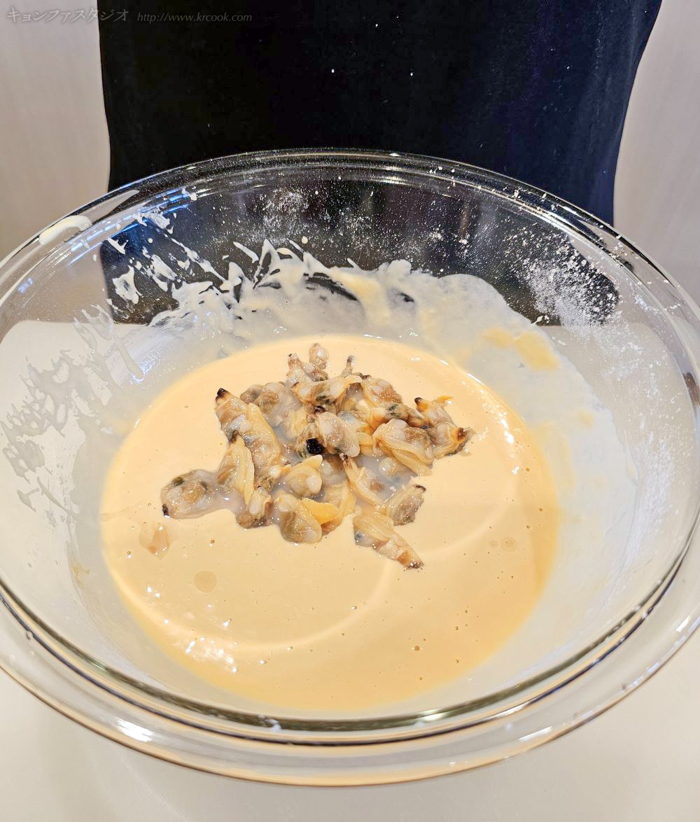 あさりは常温でほどよい状態にもどす。 - 小麦粉はふるってボウルに入れ、溶きほぐした卵と分量の水を加えて、泡立て器で手早く混ぜ合わせる(水は一気に入れないで、生地の固さをみながら加減する)。