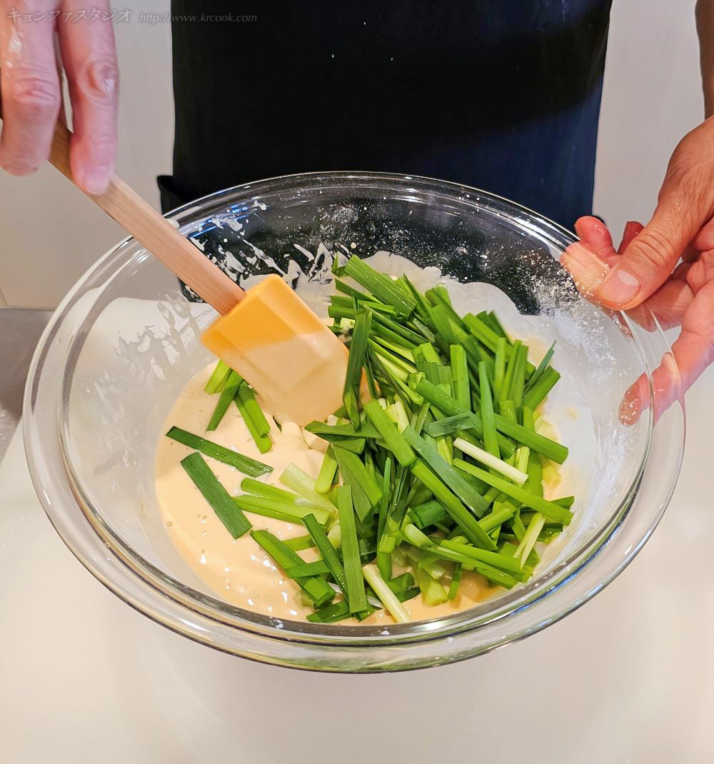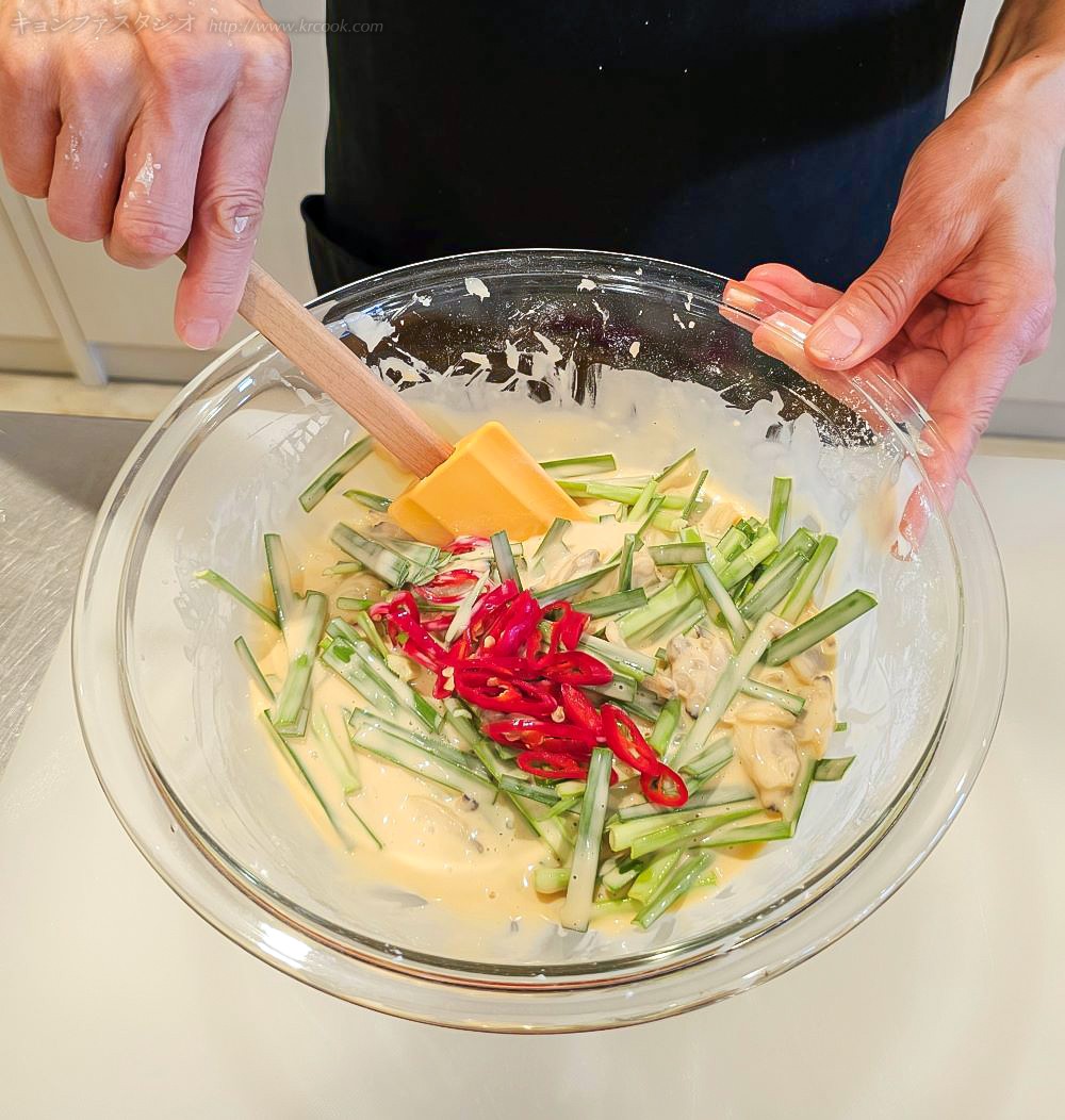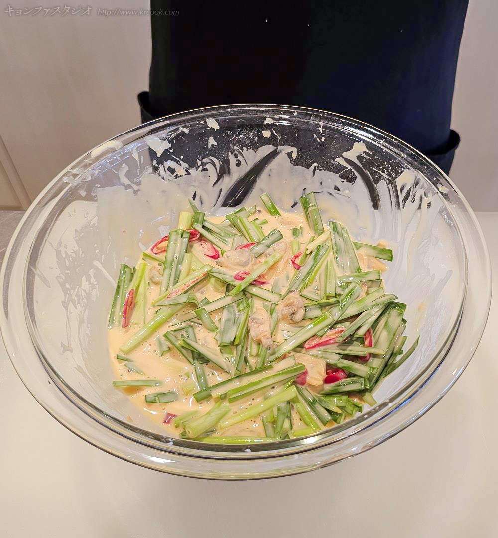 - ⑭にら、あさり、赤とうがらしを混ぜた生地